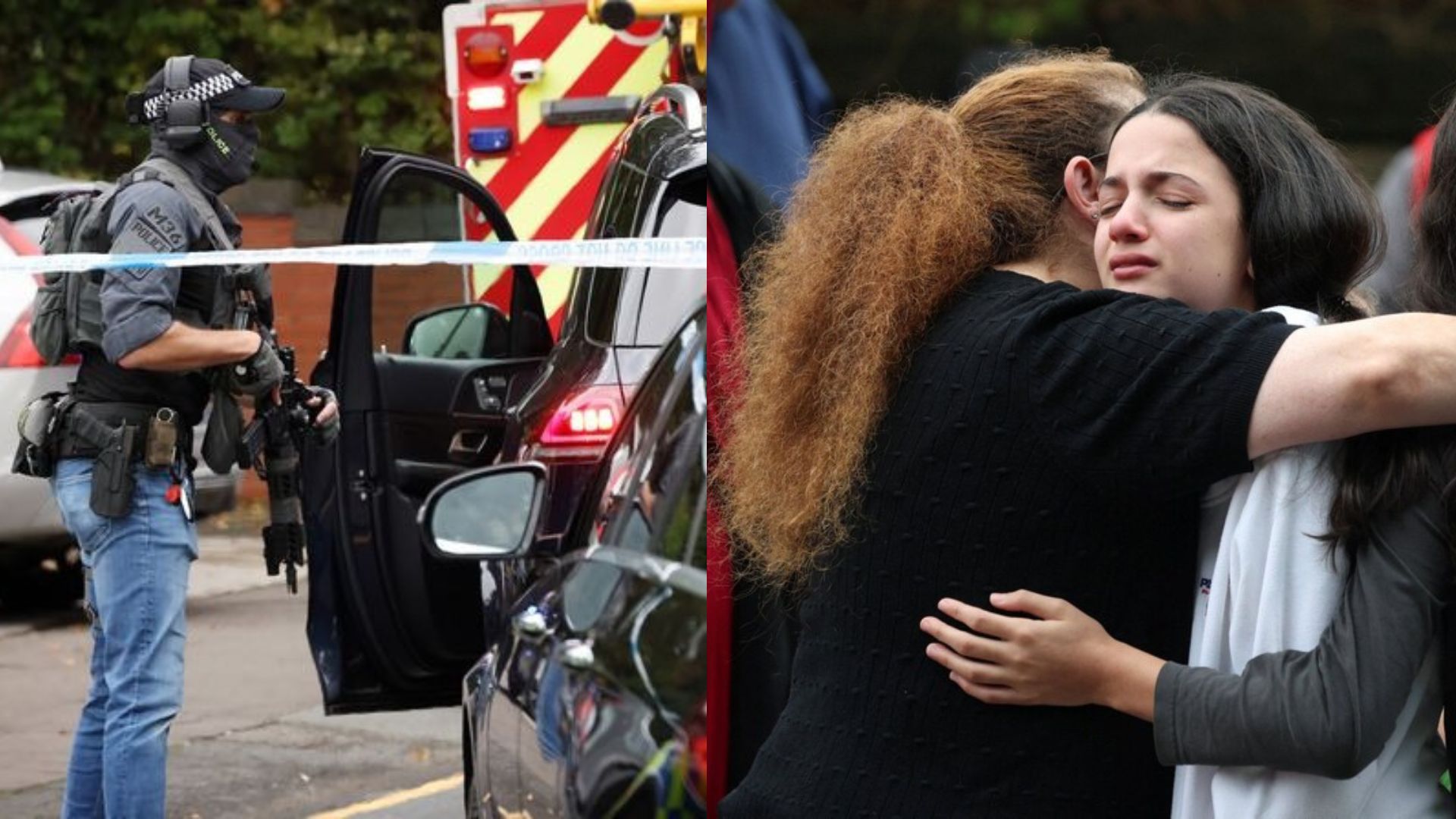 In Manchester’s Crumpsall neighbourhood, outside the Heaton Park Hebrew Congregation Synagogue, police say a man drove into pedestrians and then stabbed a guard during Yom Kippur worship.